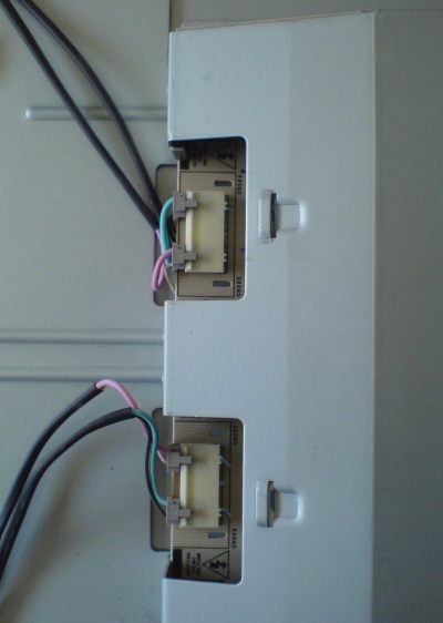 Das Innere habe ich im Sichtrahmen (der Vorderseite) auf dem Schreibtisch liegen gehabt, sodass ich den Bildschirm von hinten aus weiter zerlegen konnte. Um die Verkleidung über dem Netzteil zu entfernen, muss man zunächst oben eine und links zwei Kabel entfernen. Über den zwei Kabeln ist nochmal eine kleine Blende, die man aber einfach abnehmen kann. Damit ich hinterher wieder weiß, wie die Kabel links angeschlossen werden müssen, habe ich mir ein Foto gemacht