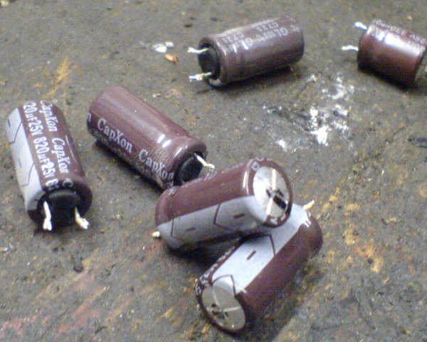 Bei mir zeigten 6 Elkos deutliche Wölbungen an der Sollbruchstelle, ausgelaufen ist allerdings noch keiner. Es handelt sich dabei um 5x 880µF und 1x 330µF, jeweils für 105°C ausgelegt!