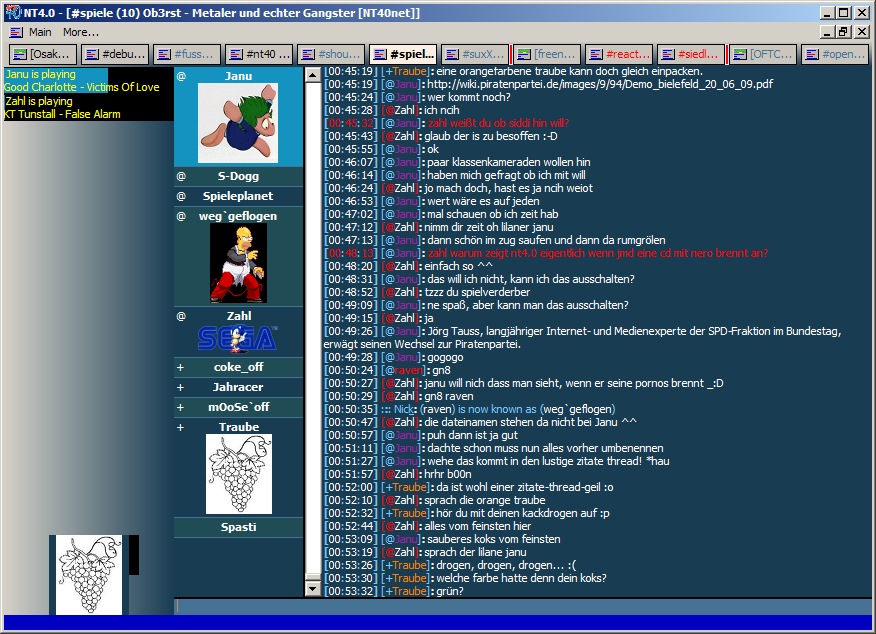 hier möchte ich direkt mal eine ungewöhnlichere Alternative zu den "normalen" IRC Clients vorstellen, nämlich NT40. Das ist ein von mir zusammengebasteltes Etwas, das ein paar mehr lustige Features im Vergleich zum IRC bietet, gleichzeitig jedoch andere Features, die erweiterte IRC Clients haben, nicht besitzt.