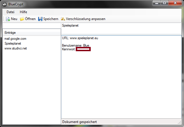 Zu dem im Screenshot ausgewählten Eintrag Spieleplanet hier mal einen Ausschnitt aus der Datei, welche von BlueCrypt erstellt wird: