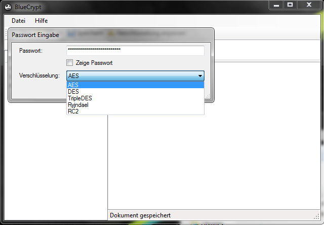 Folgender Screenshot zeigt die unterstützten Verschlüsselungsalgorithmen