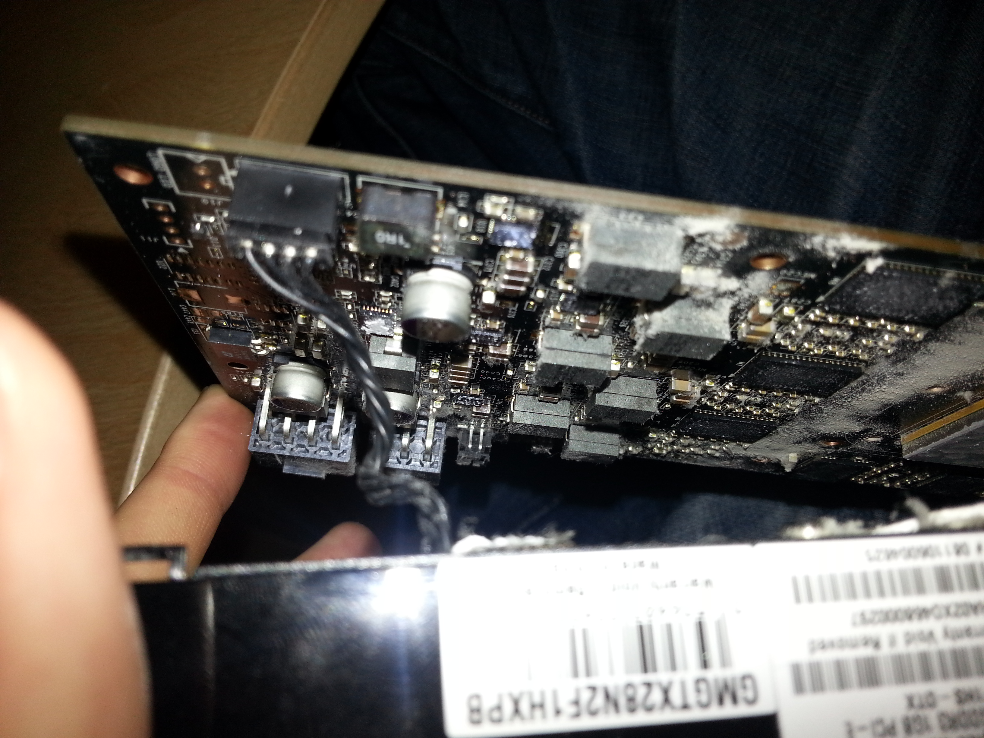 Das Mainboard ist relativ neu ich hoffe, dass da nichts mit ist, müsste ich dann aber mal gucken. Das sieht bei der GraKa auch eher schlecht aus, da das Teil komplett in Plastik steckt. Alles was man sieht ist n großer Lüfter und sonst nur die schwarze Plastikbox...