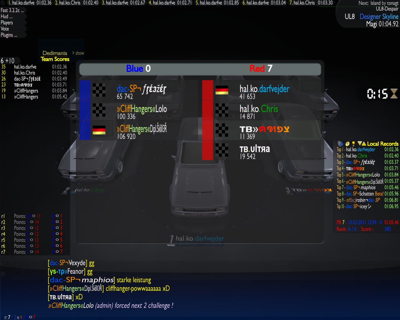 | Sooo folks, Wednesday we're heading for round 8 in the current UL season, opponent is the german traditional team hal.ko, these are the tracks: Stadium: UL8 Chaos Moving (Cl_ment) Speed: UL8 Designers Skyline (Magi) Alpine: UL8 Villa Della Captiva (Hamster) Island: UL8 Despair (Tona GT) Note: Island and Snow have been updated for some cut-fixing. Desert is a really hard freak track with mean transition-turn combos, Snow is a fast one (once again), Island is okay, Stadium is "je ne sais pas". So, who will be here on Wednesday 21h? Zuletzt geändert von killervirus | Userzuweisungen Teilnahme Ersatzbank |